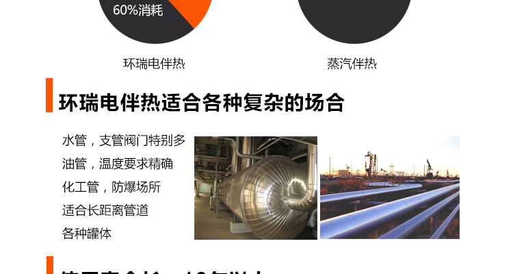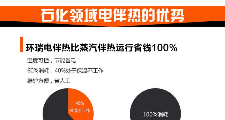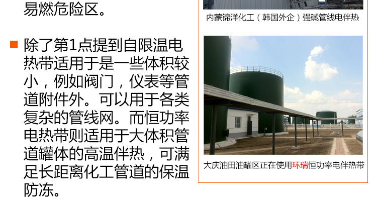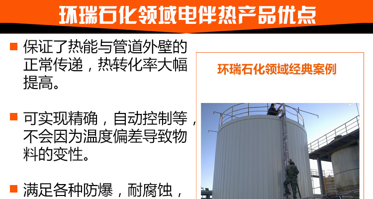 石化場所下的長距離管道,因輸送過程和長時間的儲存過程中會因散熱造成溫度下降,溫度的下降會使粘性物料的粘度升高,而對易結晶物料則可能使物料產(chǎn)生結晶,從而造成料液的輸送發(fā)生困難,嚴重的會造成管道系統(tǒng)的堵塞。為避免這種情況發(fā)生,必須對系統(tǒng)散失的熱量予以及時補充,即對系統(tǒng)進行連續(xù)不斷地加熱。 |