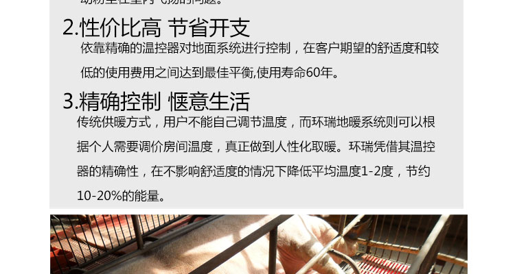 發(fā)熱電纜廣泛應(yīng)用于養(yǎng)殖場分娩舍、保育舍的采暖,高質(zhì)量的發(fā)熱電纜產(chǎn)品,使用非常安全可靠,避免了極冷冬天因天氣寒冷造成的乳、幼豬凍傷、凍死事故發(fā)生以及傳統(tǒng)的紅外線燈加熱溫度過高帶來的灼傷。相對于傳統(tǒng)的采暖,環(huán)瑞發(fā)熱電纜具備很好的優(yōu)勢。