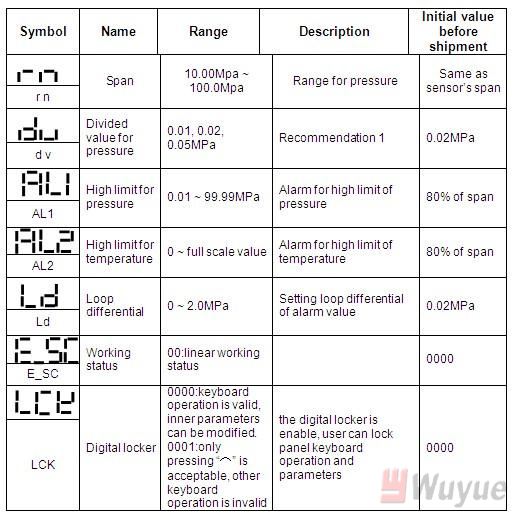 Lower Display Unit : when in normal operation, display the set pressure value. When modifying inner parameters, display parameter’s value.