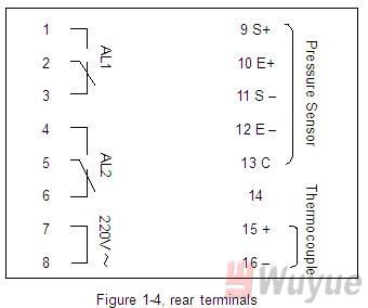 After power-on, PW806 does self-check. At the same time, the above display unit shows the full scale of pressure, and the lower display unit shows the full scale of temperature. After about 2 seconds, the above display unit shows the divided value for pressure, and the lower display unit shows the thermocouple type and divided value for temperature. Finally, PW806 return to working status automatically.