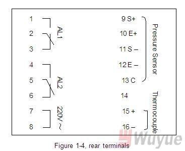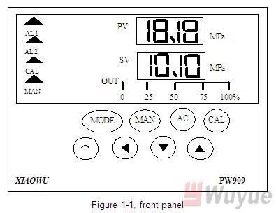 After power-on, PW909 does self-check. At the same time, the above display unit shows the full scale of pressure, and the lower display unit shows the full scale of temperature. After about 2 seconds, the above display unit shows the divided value for pressure, and the lower display unit shows the thermocouple type and divided value for temperature. Finally, PW909 return to working status automatically.