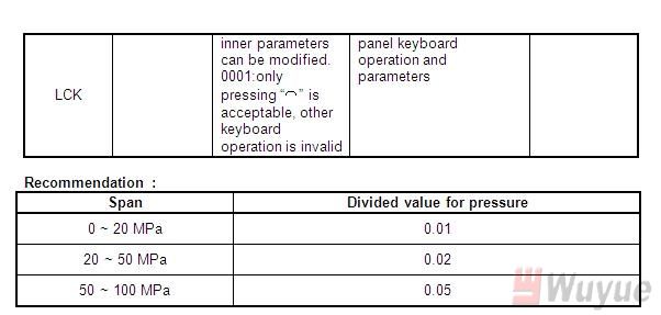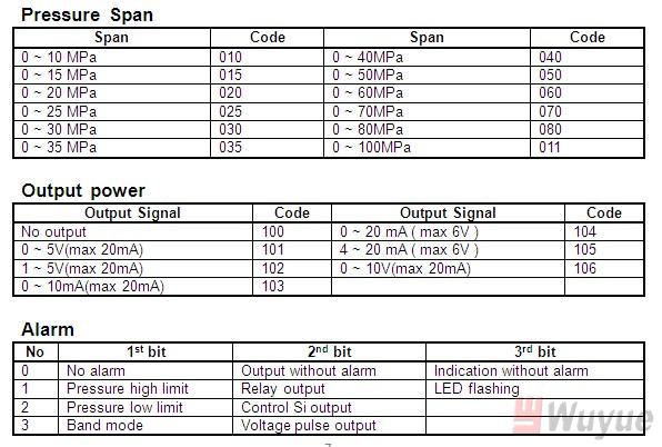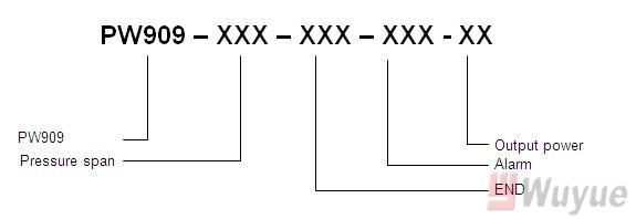 PW909-035-105-311-00 means PW909, 50MPa, 4~20mA, band mode with pressure low limit alarm.